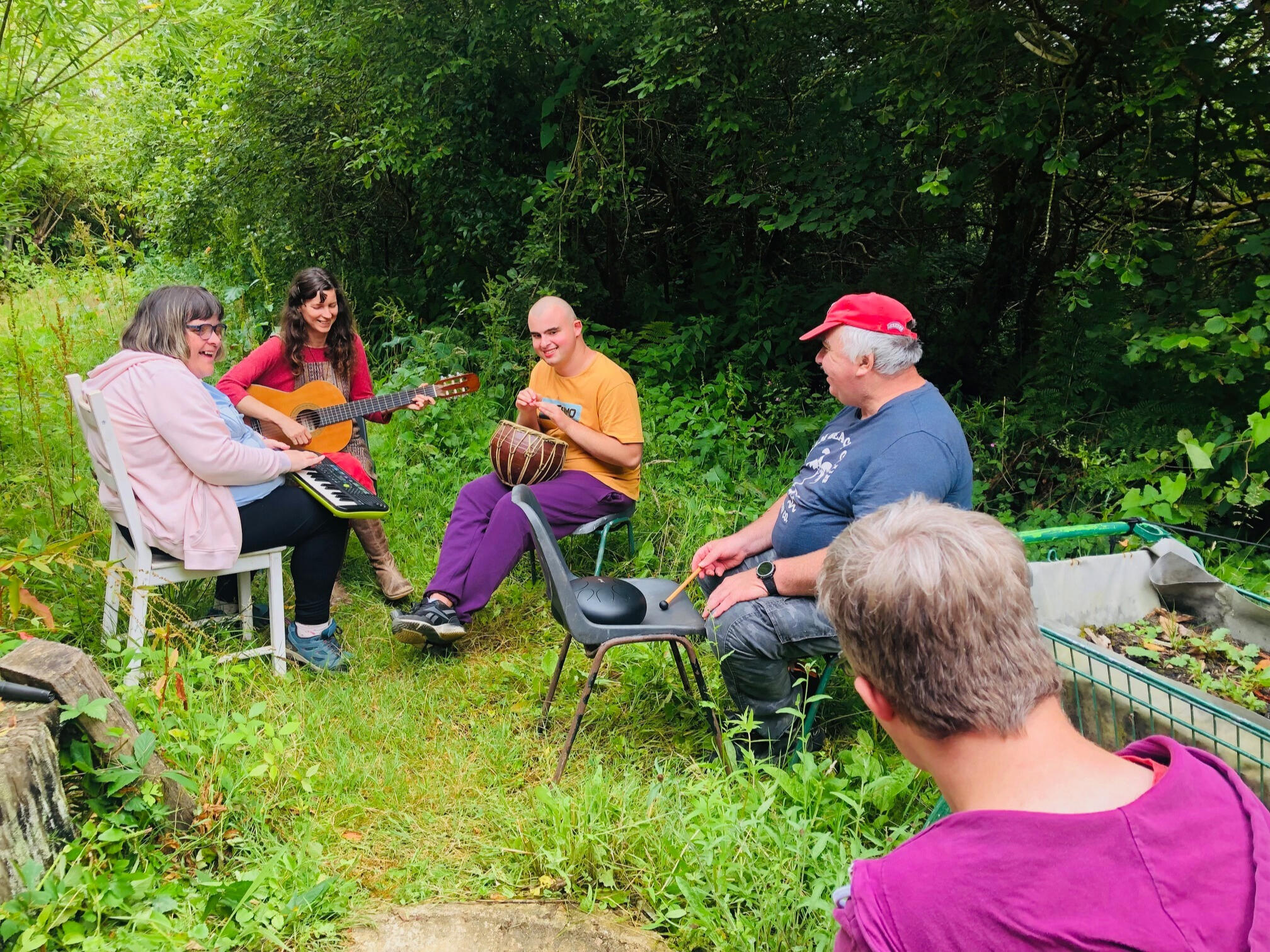 Music is a key element of our week at Holifield and an essential tool for supporting communication. We use Makaton for our singing and signing and have much enjoyment through karaoke performances of well-known songs.Wellbeing is enhanced with our sound healing sessions and at least once a week we incorporate all the instruments and have a fun jam. We also support people who have written lyrics and poems to create their own songs, which we have performed at our Big Tent Festival, our home-grown shows, Christmas events and Apple days.